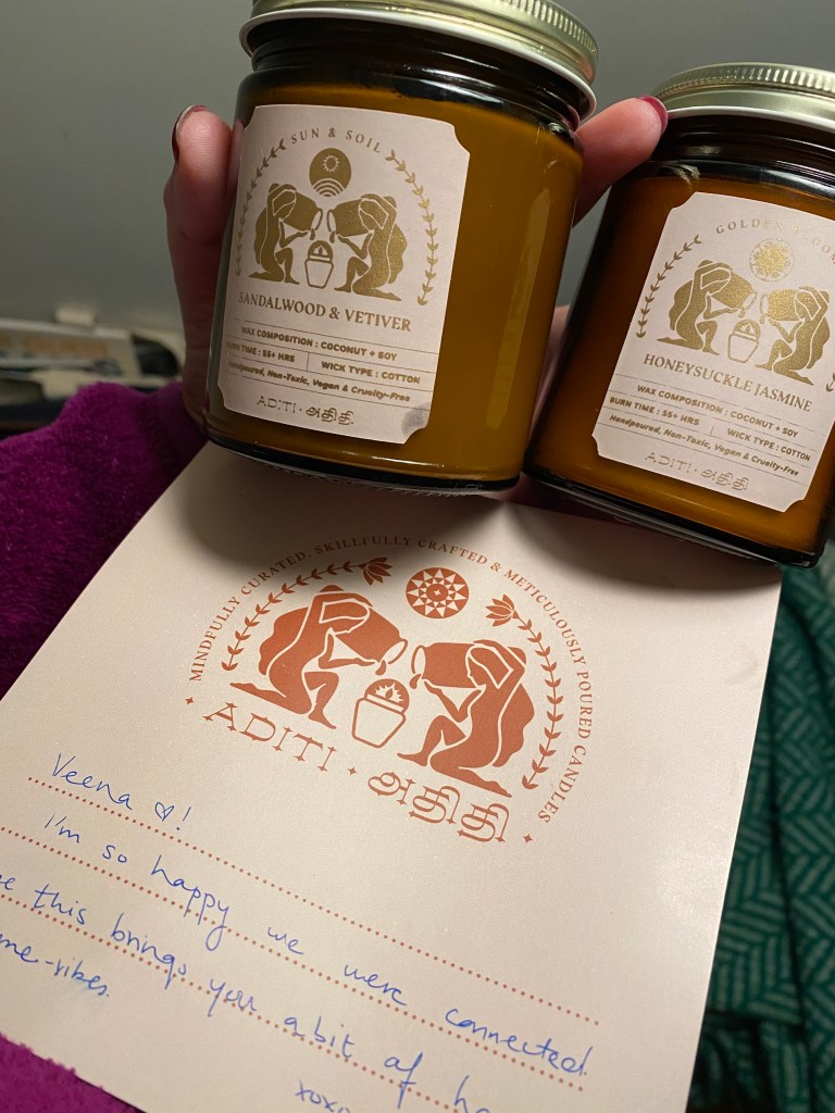 sometimes the internet can be a great place, and this is one such example. someone i follow on instagram shared aditi’s page, and i clicked over and gave her a follow. aditi is a fellow tamilian, so i decided to take a spin through her website and see what she had to offer. almost immediately i noticed that golden bloom scent full of honeysuckle and jasmine and knew i had to have it. i threw in a sun & soil [sandalwood and vetiver] candle as well for good measure, and i was thrilled when they arrived. that honeysuckle and jasmine smells absolutely divine and reminds me so much of the things i miss about living india. i will soon be gifting myself another.