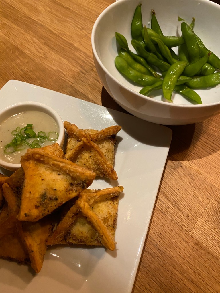 even at 7.30 on a rainy tuesday night they were packed, and although i had made a reservation we still had to wait half an hour to be seated. because of the wait, we were offered an order of edamame on the house to thank us for our patience.