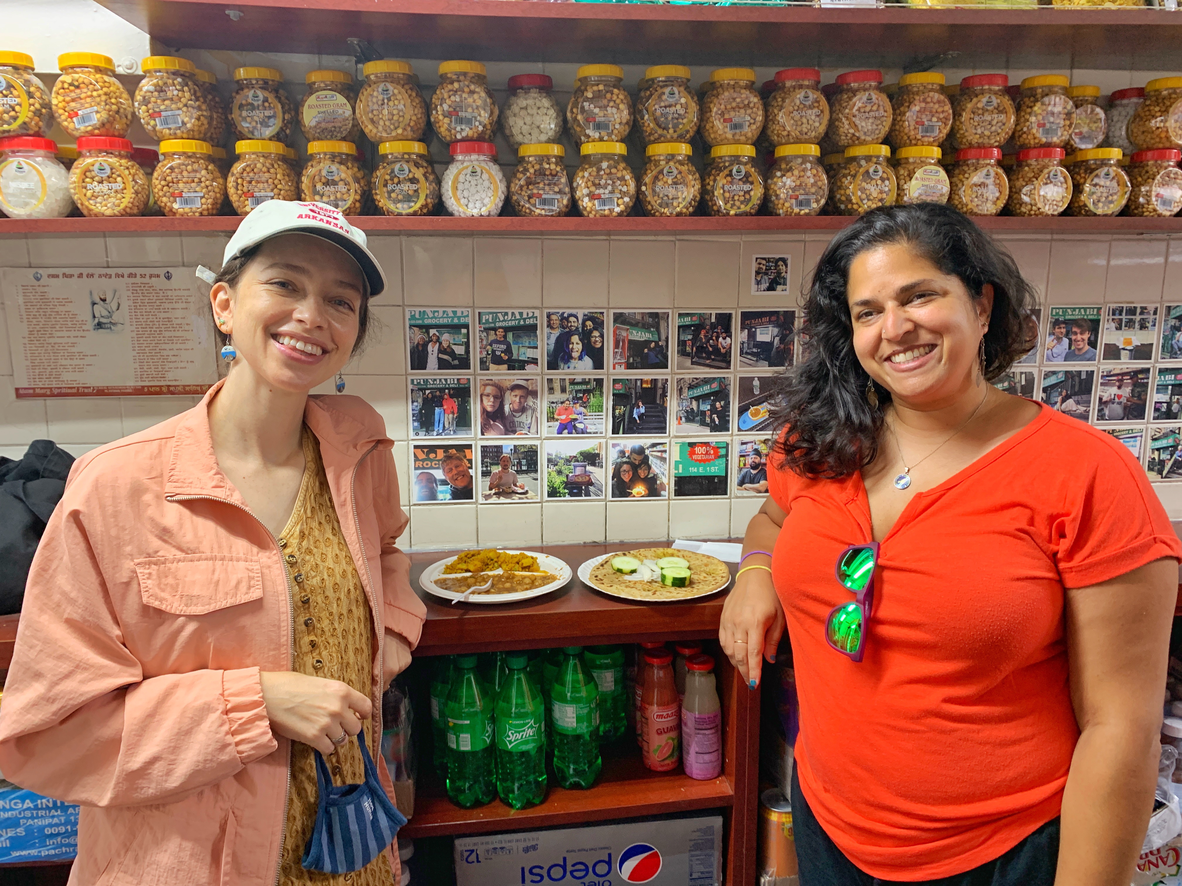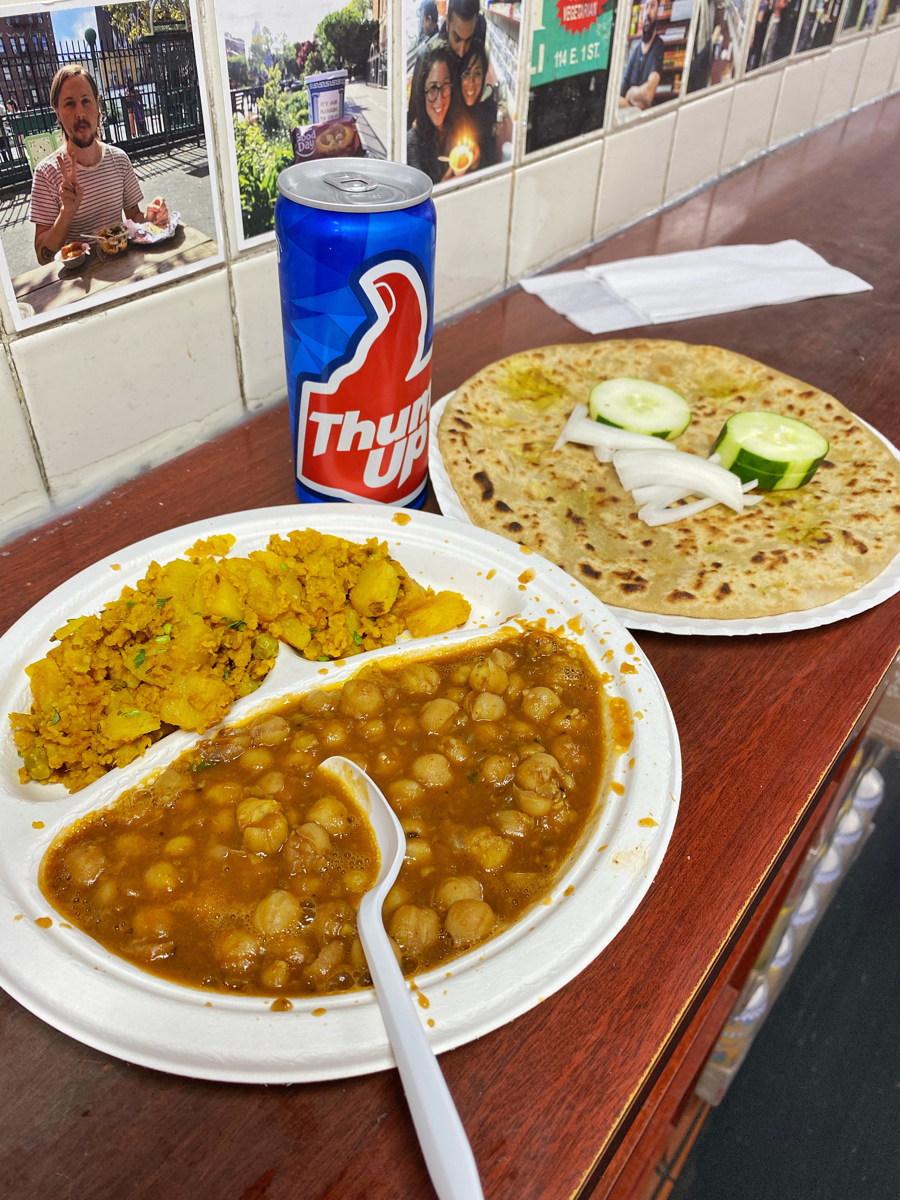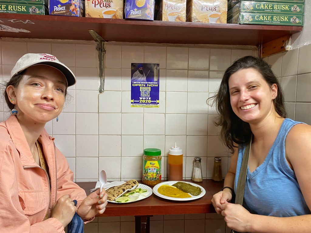 we got lucky and were the only ones in there when we visited for a late friday lunch, but it is easy to see how it can get crowded. we took advantage and ate at the counters, which came in handy because we could order extra as we wanted. i had two aloo parathas with chana and aloo gobi and molly and maggie shared two rotis with saag paneer and cabbage palya, and we finished every last bite. i also had a thums up, and we shared one of the desserts to round things out. we loved every second of our experience, including my attempts at following the hindi being spoken at me and our photo shoot after our meal. pro tip: it was empty when we went, but be prepared for a long wait at peak hours // there is limited space inside to stand and eat, but it looks like most people get it to go and eat in one of the many nearby parks // they only accept cash so come prepared or stop at the atm outside
